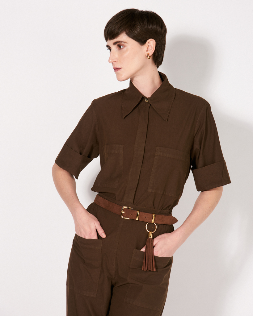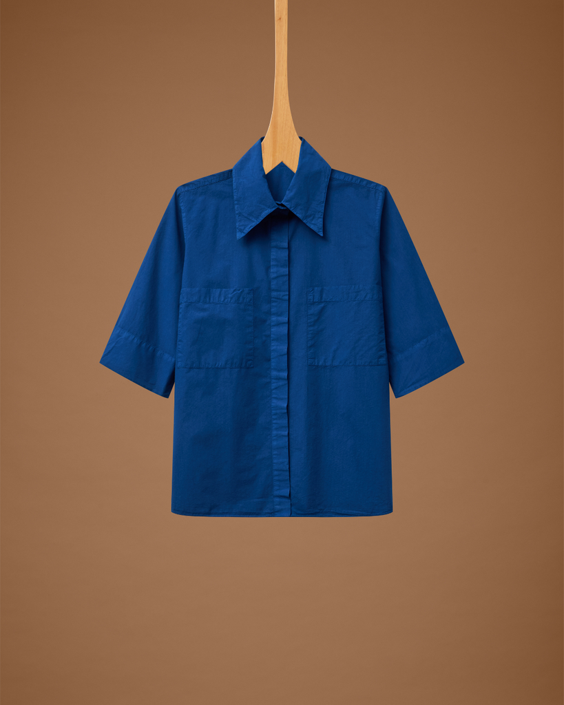 Camisa com modelagem solta, manga 3/4 com barra dupla, vista embutida, gola relax com pé de gola, bolsos frontais, pala dupla com pregas nas costas.