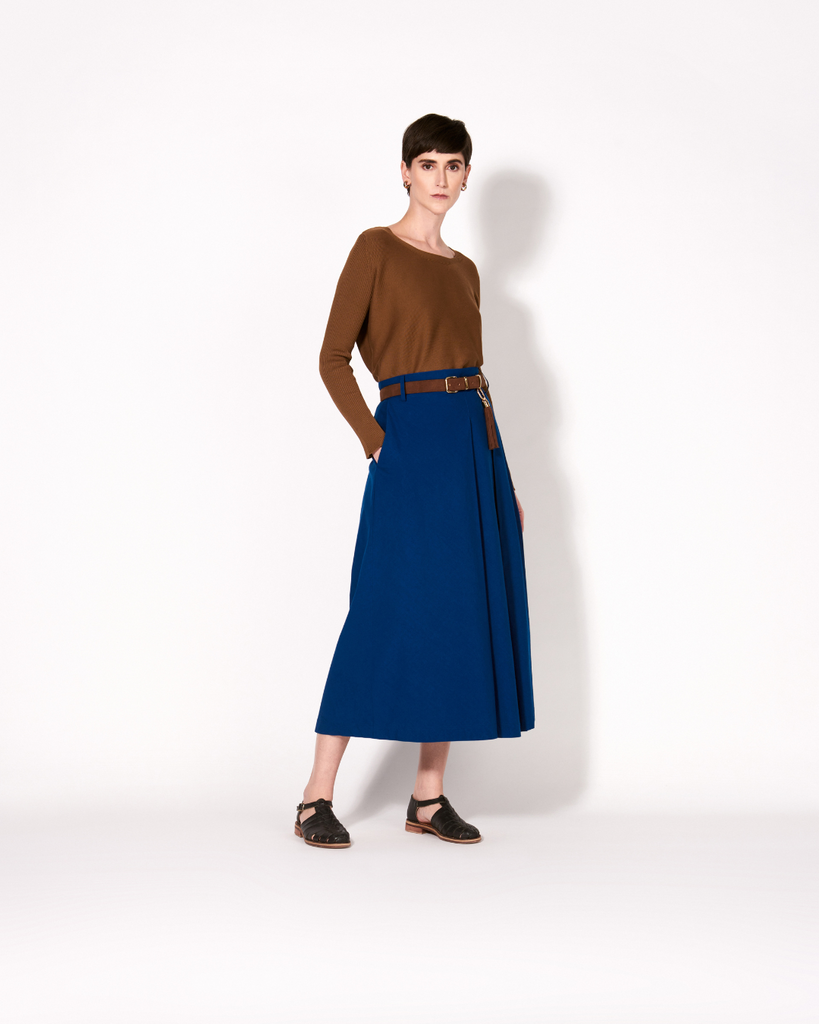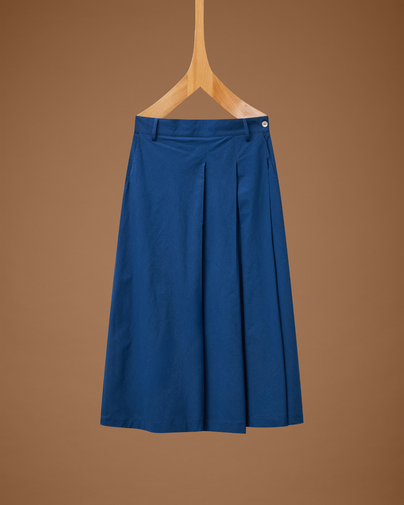 Saia com modelagem ampla e comprimento midi. Cós reto. Bolso faca na parte frontal e pregas frontais. Fechamento lateral com botão de madrepérola.