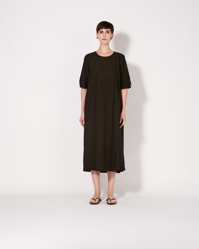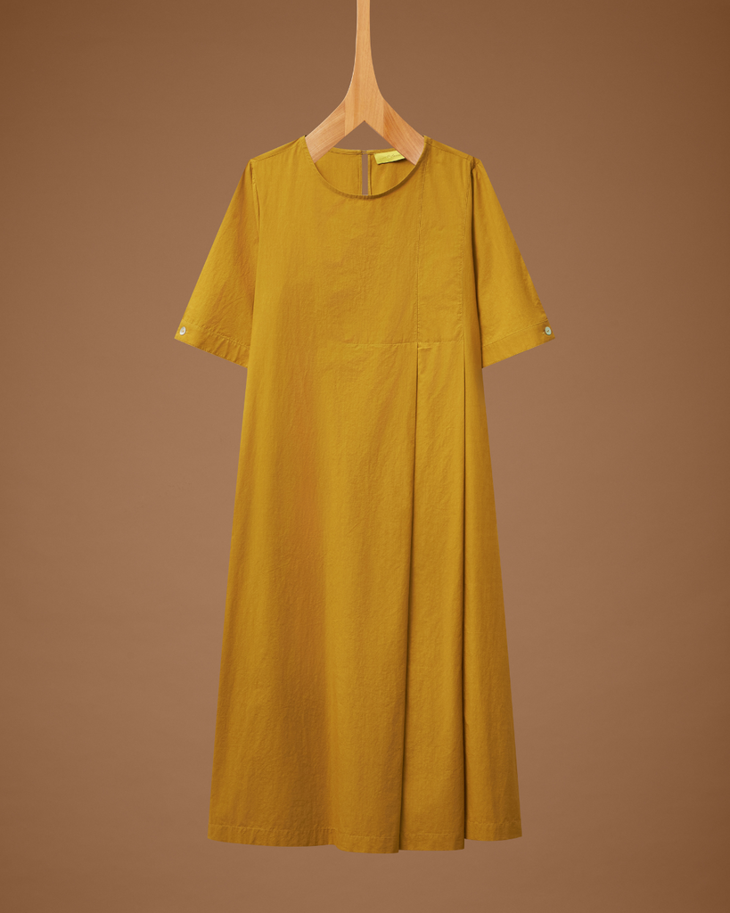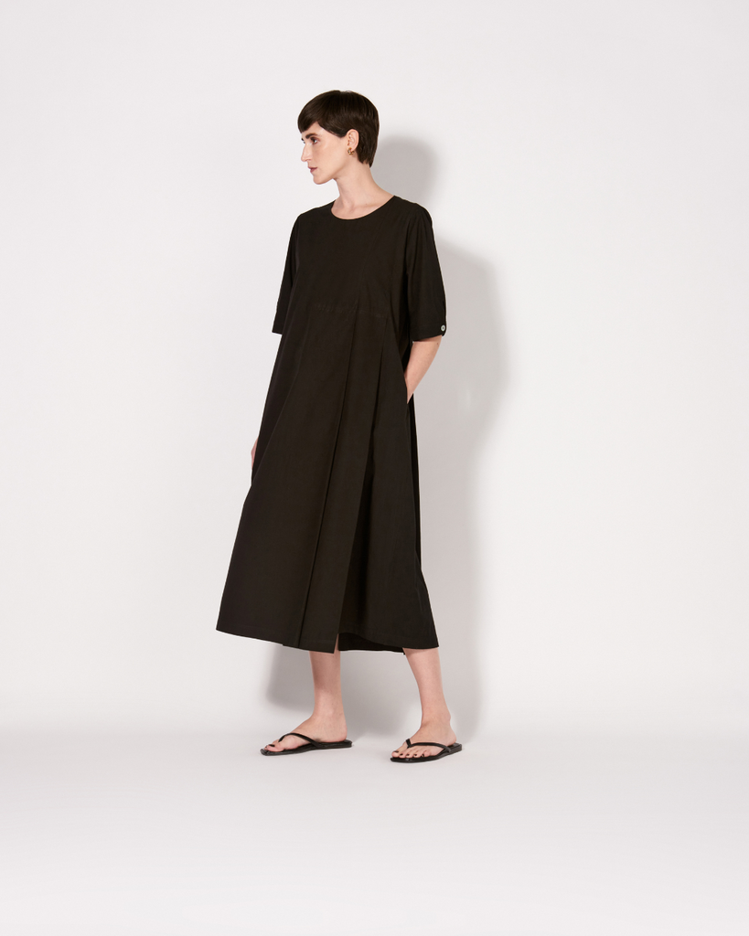 Vestido com modelagem clássica, com comprimento longuette. Possui decote careca e mangas curtas com punho e fechamento por botões de madrepérola. Pregas na parte frontal e posterior.