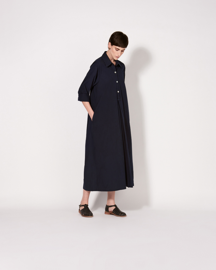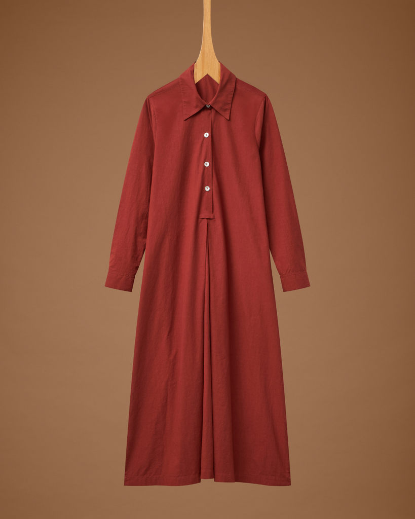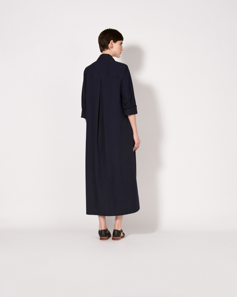 Vestido modelo chemise e comprimento longo. Gola clássica e manga longa com punho. Pala nas costas, com pregas na parte frontal e posterior. Fechamento frontal com botões de madrepérola.