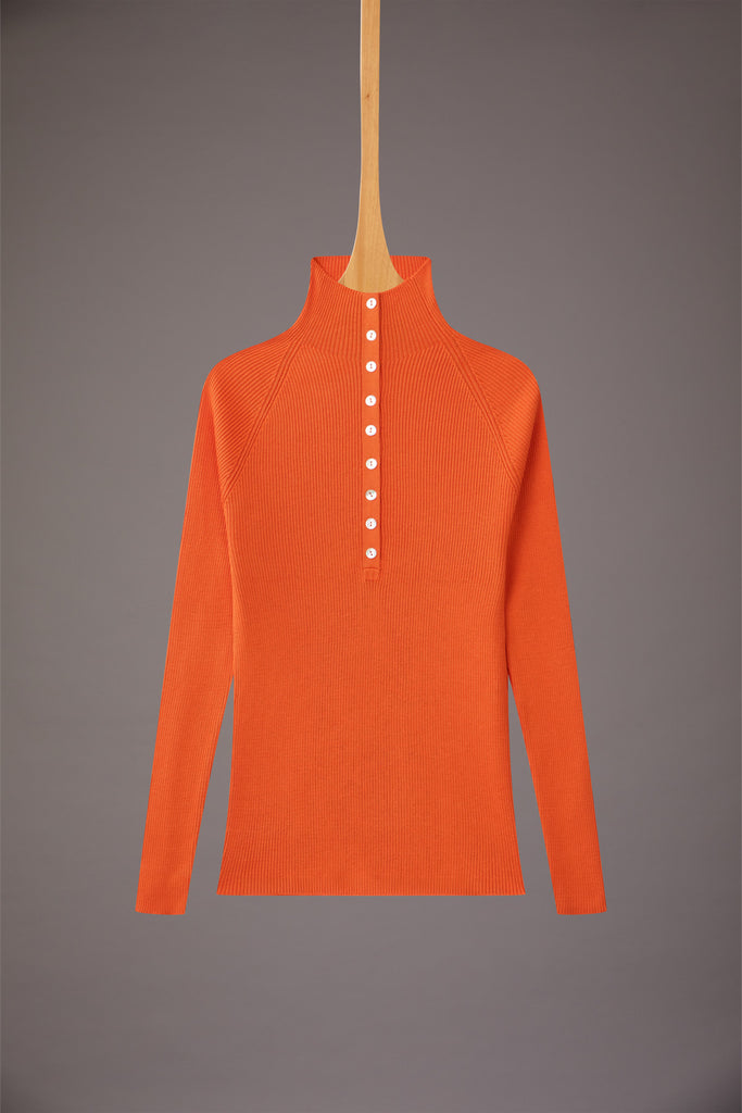 pull em meia malha canelado, modelagem próxima ao corpo, manga longa. gola alta com fechamemento de botões madre pérola.