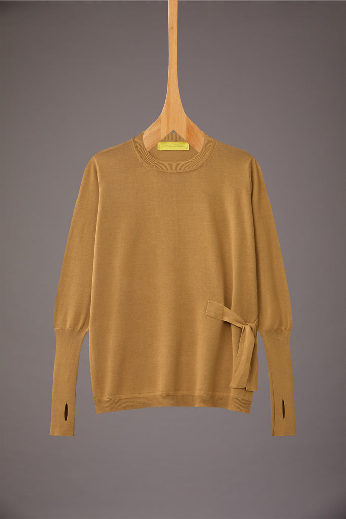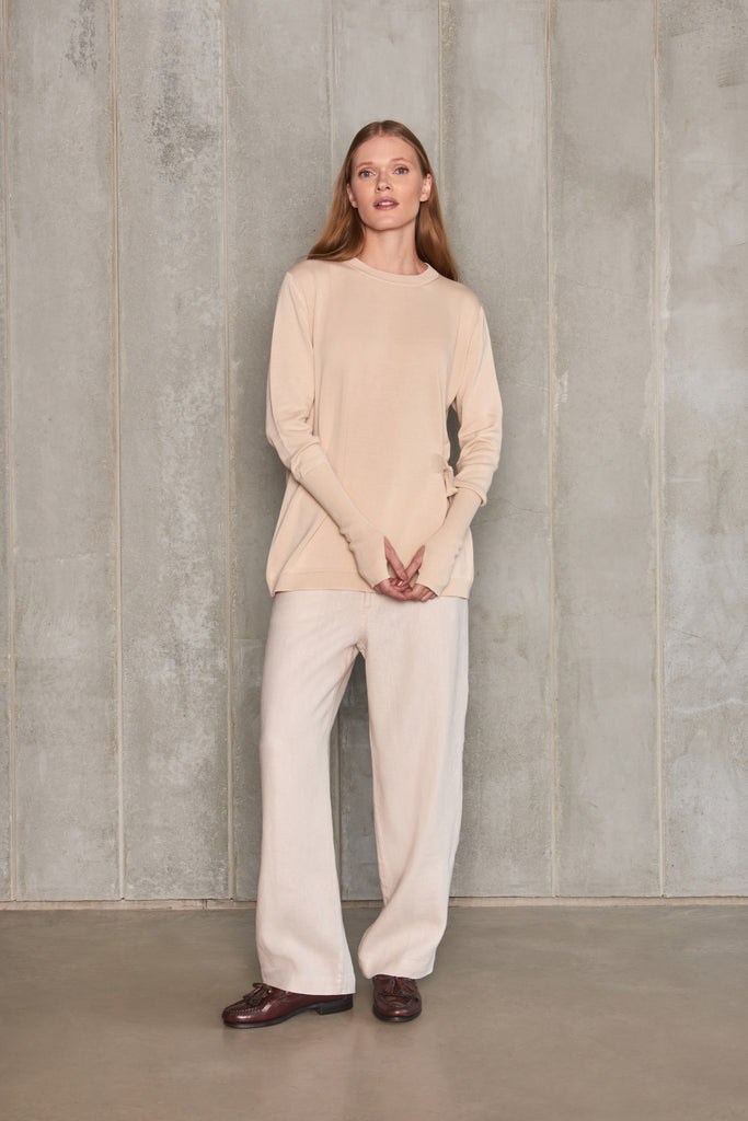 pull em meia malha, modelagem clássica com faixa ajustável na lateral, gola careca. manga longa com punho alongado canelado com abertura.